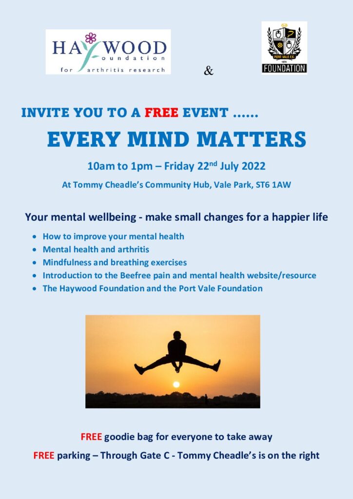 Our next event is: EVERY MIND MATTERS 10am to 1pm – Friday 22nd July 2022 At Tommy Cheadle’s Community Hub, Vale Park, ST6 1AW Your mental wellbeing – make small changes for a happier life How to improve your mental health Mental health and arthritis Mindfulness and breathing exercises Introduction to Beefree pain and mental […]